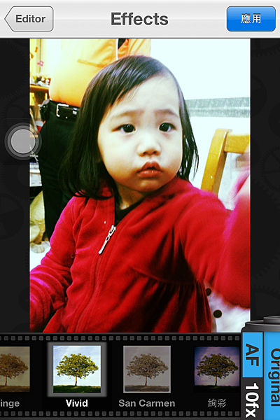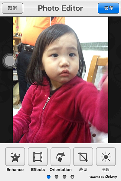 再來點兩下框框內選擇你要放入的照片, 就會進入編輯畫面囉~看你是要美白旋轉裁切加濾鏡調亮變黑白加邊框多種願望一次滿足!! (偷渡同事可愛的女兒當小麻豆XD)