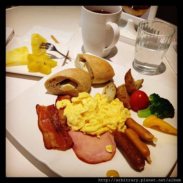 有我愛的炒蛋、培根、火腿、德式小香腸、炒洋芋、還有川燙的花椰菜、番茄跟甜椒;
