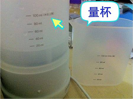 請注意水位上限是100ml, 量杯上限也是100ml, 千萬不要睡前用怕水不夠就加超過!!