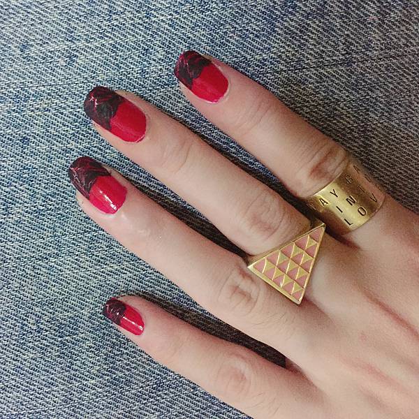 如果不敢單擦大紅色指甲油的話,可以用黑色爆裂指甲油疊擦在指甲前段1/2處,