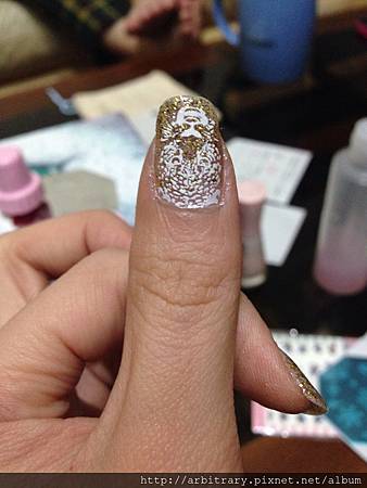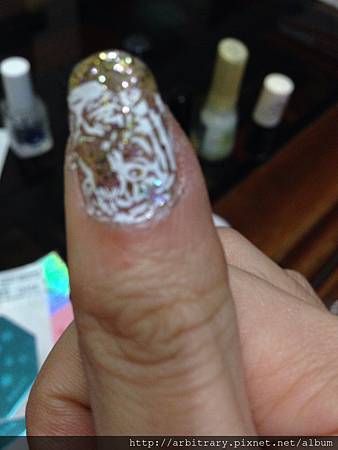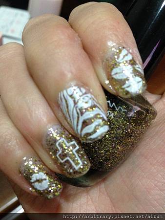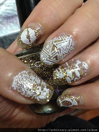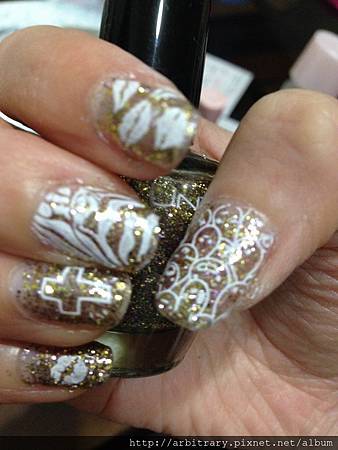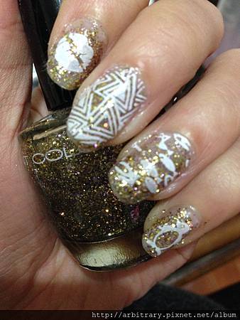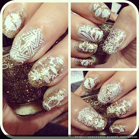 先用金色亮粉指甲油擦上漸層打底,在加上白色彩繪就完成了!